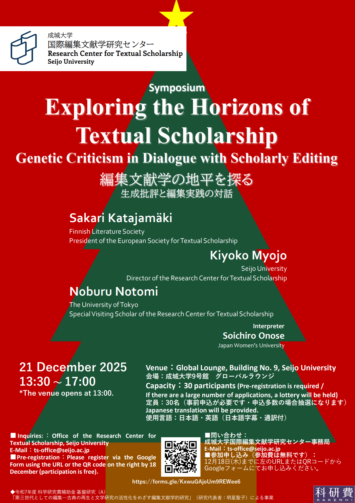 On Sunday, December 21, 2025, the Research Center for Textual Scholarship held an international symposium titled “Exploring the Horizons of Textual Scholarship: Genetic Criticism in Dialogue with Scholarly Editing” in the Global Lounge of Building 9 at Seijo University. The event attracted not only our university’s students and faculty but also many graduate students and researchers from various institutions and disciplines. Speakers and audience members engaged in lively discussions on the relationship between “textual scholarship” and “genetic criticism”, making the event both intellectually stimulating and highly successful.